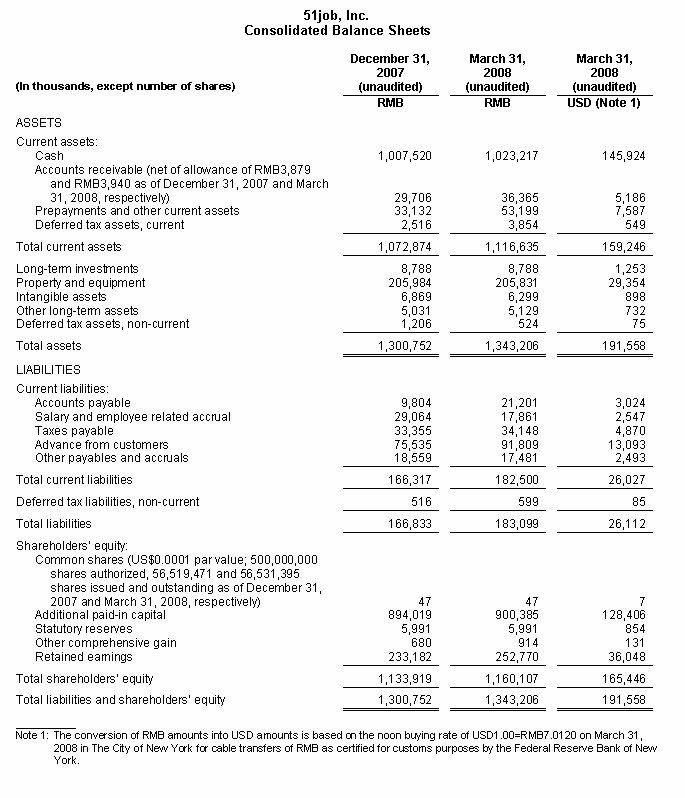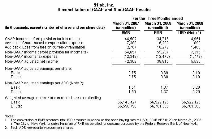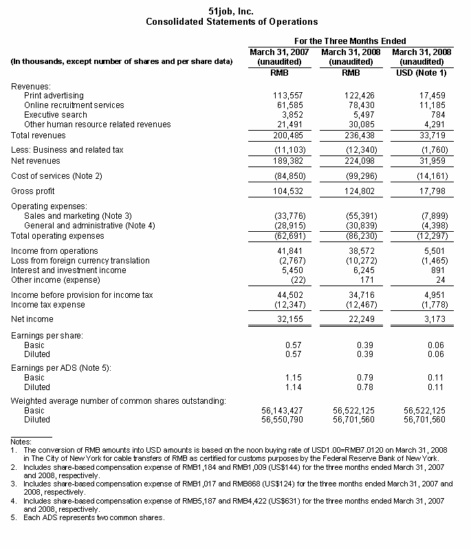Commenting on the results, Rick Yan, President and Chief Executive Officer of 51job, Inc., said, “We achieved better than expected profitability in the first quarter despite greater spending on sales and marketing activities. We are also pleased that revenues exceeded our forecast especially in light of public concerns regarding global economic conditions and the uncertain impact of new PRC labor regulations on recruitment budgets in China.” “We view 2008 as an important year of investment for 51job and are dedicating significant resources aimed at strengthening our brand, improving customer service, developing new products and increasing efficiency. We believe these efforts will enable us to extend our market leadership position and build a solid foundation for long-term growth,” said Mr. Yan. First Quarter 2008 Unaudited Financial Results Total revenues for the first quarter ended March 31, 2008 were RMB236.4 million (US$33.7 million), an increase of 17.9% from RMB200.5 million for the same quarter in 2007. Print advertising revenues for the first quarter of 2008 increased 7.8% to RMB122.4 million (US$17.5 million) compared with RMB113.6 million for the same quarter in 2007. The increase was primarily the result of a greater volume of advertisements in 51job Weekly which was partially offset by lower average revenue per page. The estimated number of print advertising pages generated in the first quarter of 2008 grew 15.6% to 4,593 compared with 3,974 pages in the same quarter in 2007. Average revenue per page in the first quarter of 2008 decreased 6.7% over the same quarter in 2007 due to growing revenue contribution from lower priced cities. Online recruitment services revenues for the first quarter of 2008 were RMB78.4 million (US$11.2 million), representing a 27.4% growth from RMB61.6 million for the same quarter of the prior year. The increase was mainly attributable to the growth in the number of employers using the Company’s online services. Unique employers using the Company’s online recruitment services increased 25.8% to 60,461 in the first quarter of 2008 compared with 48,070 in the same quarter of the prior year. Executive search revenues for the first quarter of 2008 increased 42.7% to RMB5.5 million (US$0.8 million) from RMB3.9 million for the same quarter in 2007 due to greater candidate placements. For the first quarter of 2008, other human resource related revenues grew 40.0% to RMB30.1 million (US$4.3 million) from RMB21.5 million in the first quarter of 2007 due principally to greater customer demand for human resource outsourcing services. Gross profit for the first quarter of 2008 was RMB124.8 million (US$17.8 million), representing an increase of 19.4% from RMB104.5 million for the same quarter of the prior year. Gross margin, which is equal to gross profit divided by net revenues, was 55.7% in the first quarter of 2008 compared with 55.2% in the same quarter in 2007. Operating expenses for the first quarter of 2008 increased 37.5% to RMB86.2 million (US$12.3 million) from RMB62.7 million for the same quarter of 2007 due primarily to higher sales and marketing expenses. Operating expenses as a percentage of net revenues was 38.5% for the first quarter of 2008 compared with 33.1% for the first quarter of 2007. Excluding share-based compensation expense, operating expenses as a percentage of net revenues was 36.1% in the first quarter of 2008 compared with 29.8% in the first quarter of 2007. Sales and marketing expenses for the first quarter of 2008 increased 64.0% to RMB55.4 million (US$7.9 million) from RMB33.8 million for the same quarter of the prior year resulting primarily from an increase in advertising and promotion expenses as well as staff additions and wage increases leading to higher employee expenses. General and administrative expenses for the first quarter of 2008 was RMB30.8 million (US$4.4 million) compared with RMB28.9 million in the first quarter of 2007 due primarily to higher staff costs, office expenses and professional services fees, which were partially offset by lower share-based compensation expense. Income from operations for the first quarter of 2008 decreased 7.8% to RMB38.6 million (US$5.5 million) from RMB41.8 million for the same quarter of the prior year. The Company’s effective tax rate was 35.9% in the first quarter of 2008 compared with 27.7% in the first quarter of the prior year due primarily to an increase in the loss from foreign currency translation as a result of the appreciation of the Renminbi against the U.S. dollar. Loss from foreign currency translation is not deductible from taxable income under PRC tax law. Net income for the first quarter of 2008 decreased 30.8% to RMB22.2 million (US$3.2 million) from RMB32.2 million for the same quarter in 2007. Fully diluted earnings per common share for the first quarter of 2008 were RMB0.39 (US$0.06) compared with RMB0.57 for the same quarter in 2007. Fully diluted earnings per ADS for the first quarter of 2008 were RMB0.78 (US$0.11) compared with RMB1.14 in the first quarter of 2007. In the first quarter of 2008, the Company recognized total share-based compensation expense of RMB6.3 million (US$0.9 million) compared with RMB7.4 million in the first quarter of 2007. The Company also recognized a foreign currency translation loss of RMB10.3 million (US$1.5 million) in the first quarter of 2008 compared with a translation loss of RMB2.8 million in the first quarter of 2007 resulting from the appreciation of the Renminbi against the U.S. dollar. Excluding share-based compensation expense and foreign currency translation loss which had no impact on the Company’s cash earnings, non-GAAP adjusted net income for the first quarter of 2008 decreased 8.3% to RMB38.8 million (US$5.5 million) from RMB42.3 million for the first quarter of 2007. Non-GAAP adjusted fully diluted earnings per common share were RMB0.68 (US$0.10) in the first quarter of 2008 compared with RMB0.75 i